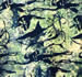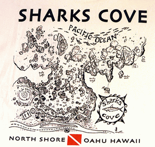 shirt is blue, navy and green with sharks and divers