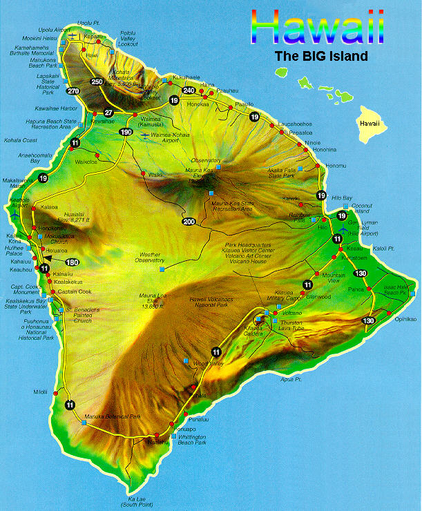 LAPAKAHI STATE HISTORICAL PARK - north of Kawaihae, was once an ancient Hawaiian fishing village. LAUPAHOEHOE - which literally translated means "leaf of lava" is one of the Hamakua Coast's many scenic and historic spots. LAVA FLOWS - are marked by Warrior signs which designate flows which have surged down the mountains of Mauna Loa and Kilauea since prehistoric times. LYMAN MISSION HOUSE MUSEUM - in the city of Hilo, contains a collection of historic Hawaiian relics. ORCHIDS AND ANTHURIUMS - grow in profusion in Hilo and surrounding areas for export to far ports of the world. PAINTED CHURCHES - at Honaunau, St. Benedict's is the oldest Catholic church on the Island constructed in 1875. The church has brilliantly hued murals depicting biblical scenes on the interior walls. Murals in the Star of the Sea Catholic church at Kalapana were painted by a priest half a century ago. PARKER RANCH - in the Waimea-Kamuela district at the foot of Mauna Kea, is the second largest cattle ranch under the American flag, and the largest privately owned cattle ranch in the world. POLOLU VALLEY - in Kohala, was once the locale of a number of ancient Hawaiian heiau (temples). PU'UHONUA O HONAUNAU (PLACE OF REFUGE) - a National Historical Park, is said to have been built at the Honaunau location in the 12th century to provide political and religious asylum. PUUKOHOLA HEIAU - near Kawaihae, was built by Kamehameha the Great and is now a National Historical Site. RAINBOW FALLS - one of the Big Island's loveliest waterfalls, is located in Hilo. WAHA'ULA HEIAU - at the foot of the Chain of Craters Road is maintained by the National Park Service as part of the Volcanos National Park. Walking tours available. WAIPIO VALLEY - north of the town of Honokaa, was once the home of kings of old Hawaii. WHITE SAND BEACHES - Hapuna State Beach Park, Anaehoomalu Beach, and Magic Sands Beach, Kailua, all on the western side of island. |