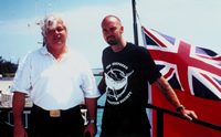 individuals, groups and organizations shall: The effectiveness of the Sea Shepherds is undeniable, it is the tactics with which people voice their disapproval. The question than becomes, at what point do you take action to prevent the annihilation of even more species? When do we start enforcing the laws which supposedly protect the earth's biodiversity? Furthermore, why aren't these laws being enforced in the first place? The answer is quite simple. Theres no money in it!!! Yet another question. Who is willing to leave their current life behind, live on a ship, do some of the dirtiest work imaginable six or seven days a week, live a life of poverty and receive no pay? What's your reward? You get to enforce international laws which the governments of the world put into place, but almost never enforce. If this sounds good, than the life of a Sea Shepherd crewmember is for you. Not even Paul Watson is paid. Money is not the issue to these people. Even those who disagree with the organizations tactics find it difficult not to respect the dedication of the individuals involved. Especially when compared to nonprofit organizations like Greenpeace or the United Way or countless others which have embarrassments for executives who take home six figure salaries all in the name of charity. Another common accusation is the belief that Watson and others in this movement care more about animals than they do people. "I believe first and foremost in the laws of ecology, the laws of biodiversity, the law of interdependence, the law of finite resources, and what these laws state is that we are dependent upon the biodiversity in order to survive. The human species is not going to survive by itself, so when you destroy another species you weaken the ability of the human species to survive overall. But most other species, whether it be plants or animals, live in accordance to the laws of the ecology. Any species that does not live in accordance with the laws of the ecology is buying time and we're really not going to survive unless we do so. These are just basic, physical, ecological laws that have to be respected. To not do so is the equivalent of shuffling the deck chairs around on the Titanic, you're not going to survive anyway. You might be able to solve a human rights problems here or deal with this issue there, but what's the point of doing that if you've eroded your entire foundation of support beneath you, and you've developed an ecosystem that can't support any life, our human life, included." I then asked him what the average working Joe who cares can do? "The average working Joe doesn't really care about these issues but for the average working Joe who does care about these issues, start getting involved and I think that would certainly help. But unfortunately the majority of people don't give a damn about what's going to happen tomorrow they'd rather watch TV or simply spend money. Most people are quite content living in a fantasy world. They believe everything from angels to flying saucers to whatever. Basically these are all circuses humans have fabricated in order to keep people in line for the last 2000 years. Circuses always change, but as along as you keep people entertained, you keep them from noticing what's really going on in the world." When asked what he wants to see from people? "Stop being so goddamn arrogant and start realizing you are a citizen of this planet. We've got to learn to live in harmony, otherwise we are going to doom ourselves to extinction, it's as simple as that." Watson clearly lacks any noticeable concern about public opinion. If he has an ulterior motive it remains undetectable. His honesty and candor is abrupt, but refreshing. If whales and dolphins and all the life of the seas could talk however, there can be zero doubt that they would praise Watson as the legend of all legends. If they could cheer for him, buildings would topple from their thunderous noise. If they could vote, Watson would be their president. This all doesn't seem to matter to him though. What does matter is results, and it seems that unless Watson is killed, which is a distinct possibility, he will continue to save more marine life than anyone else ever has. For divers who derive as much joy from our experiences in the oceans as anybody, we owe Watson a debt of gratitude for his results. For those who cannot agree with his tactics and therefore do not appreciate the results, rest assured that your grandchildren, and the children born from them will. The reality is that Watson speaks more to the future generations than he does to us. He is a true visionary whose actions in life are determined by the realities of the future. The gauntlet in which all visionaries inevitably walk awaits him, but as Watson says himself; "We may be a real pain in the rear to the establishment today, but we make great ancestors." Photos and Captions Damaged ship photo Men in front of