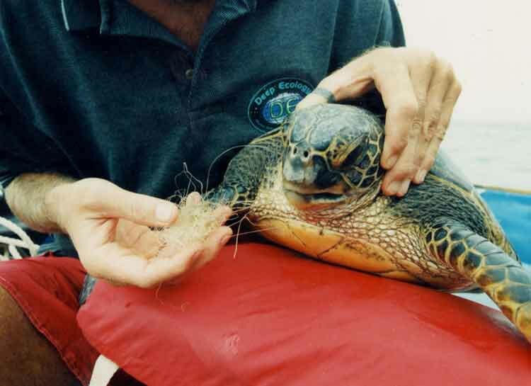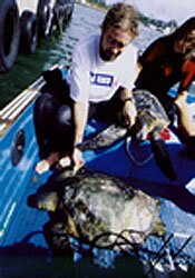 Ken's Photo Album/Ken---Sea-Turtle-with-Swall.jpgPrevious | Home | NextTurtle Rescues #11 #12 #13 "Tom", "Gonzales", "Keller" Thanksgiving Day, Nov. 25th, 1999 Puaena Point, Sharks Cove and Haleiwa Harbor, Oahu On the previous day our instructor, Dan, sighted a turtle with line in his mouth and wrapping around his fin, while conducting a tour with a customer. He was unable to capture the turtle so we came back later that afternoon to find him. Upon our return we found him immediately and started pursuing him. We followed him for approximately a half hour and never got closer than 5 ft from him. We decided to come back the next day, Thanksgiving Day. A group of six staff members and one customer set out early and stopped by one of our turtle cleaning stations outside the harbor. I jumped in just to check things out and sure enough I spotted a medium sized turtle (Tom) with line choking off circulation in his right front fin. I apprehended him easily as he was quite lethargic. Once on the boat I knew his fin would be amputated. Officials said it would be two hours before they could arrive so we set out for the turtle we followed the day before. Once at Sharks Cove we dove down and saw him almost immediately. Once again a pursuit ensued with myself and Chris (our Divemaster artist) shooting video. I had decided from the previous day that I might abandon my scuba gear so that I could follow him above from the surface with less drag. The day before had been very frustrating and I was hell bent to get him today. I knew at the least he would lose one fin if I didn't or quite possibly die. So after another exhausting half hour pursuit Chris dropped back and I ditched my gear and continued pursuit on the surface watching him 40 ft below. About 15 minutes later I saw him coming up and positioned myself above. Sure enough, after 45 minutes I grabbed hold of him, on his surface for breath, which he sorely needed. A tremendous relief came over me. I named him "Gonzales" as in Speedy. Once back in the harbor we turned over the turtles. Shortly after, a large turtle with tumors and fishing line swam by the dock. I jumped in and got him. Unfortunately he was blind in one eye and nearly so in the other (thus his name "Keller" i.e. Helen Keller), sadly we believe he will not make it. All in all, it was an amazingly up and down day. Our biggest hope is that by our efforts, others will become more aware and help us change things for the better. |